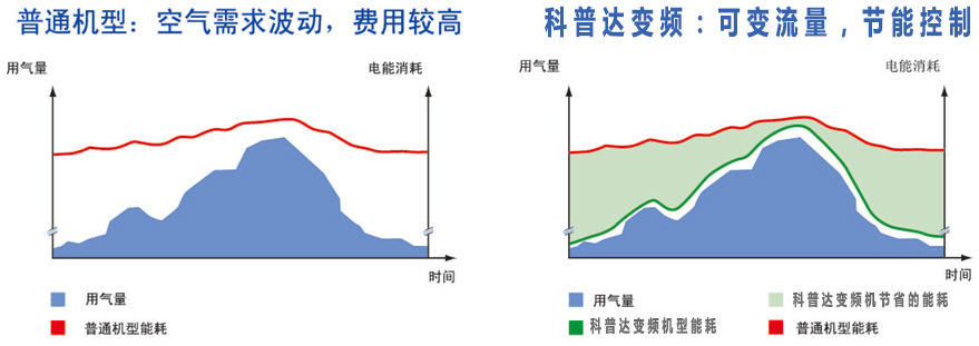 科普達技術領先的科普達變頻空氣壓縮機 可以精確地滿足用戶的空氣需求。當用戶的用氣量降低時,轉速調低,排氣量相應減小,同時能耗也按比例下降。通過先進的變頻技術,大大減少了空壓機的卸載,使能耗大大下降。